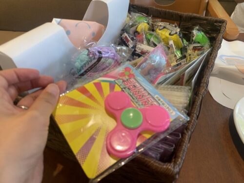 到着前にエプロンとおもちゃを貰いました。