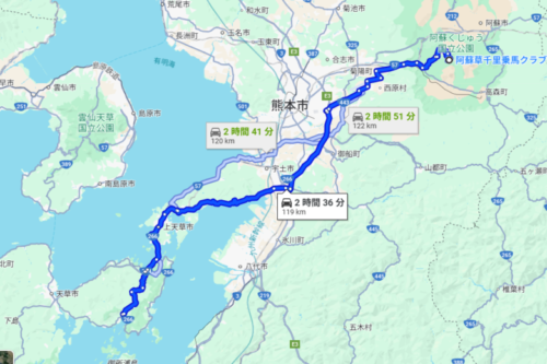 そもそも熊本市から草千里までも距離がありますし(車で1時間くらい)、天草から阿蘇くまもと空港までも相当な距離(車で2時間くらい)があります。