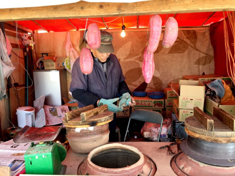 吊るした芋り窯がある露店を発見し、近づいてみると焼いも屋さんでした。