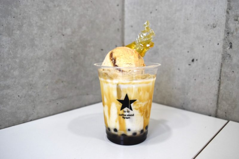 季節限定の「濃厚黒糖きな粉フロートタピオカ」(税込600円)。上にアイスが乗っていて、飴細工まで! これは他のお店には無かったですよ! ガーッとかき混ぜてしまうも良し、分けて味わうも良しです。今月で終了のメニューかも、とのことなのでお早めに!