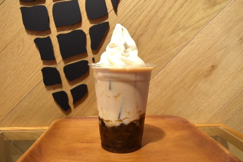 九州産の牛乳を100%使った九州ソフトクリームファクトリーの「九州ミルク」を上にトッピングした「タピオカミルクティーwith九州ミルク」(税込650円)。ミルクティーは宮崎県産の濃いめに淹れた紅茶を使っているので、なめらかな口どけの濃厚なソフトクリームを溶かしながら飲むとより濃いミルクティーに仕上がりますよ!