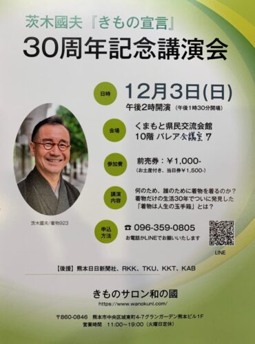 着物サロンって敷居が高いなと思われる方、12月3日(日曜日)くまもと県民交流会館10階パレア会議室7にて代表の茨木國夫さんの講演会があります。ざっくばらんなお話で「こんな生き方もあるのか」、と楽しい公演になるかと思いますので是非!お申込みは096-359-0805まで。当日券もありますよ。