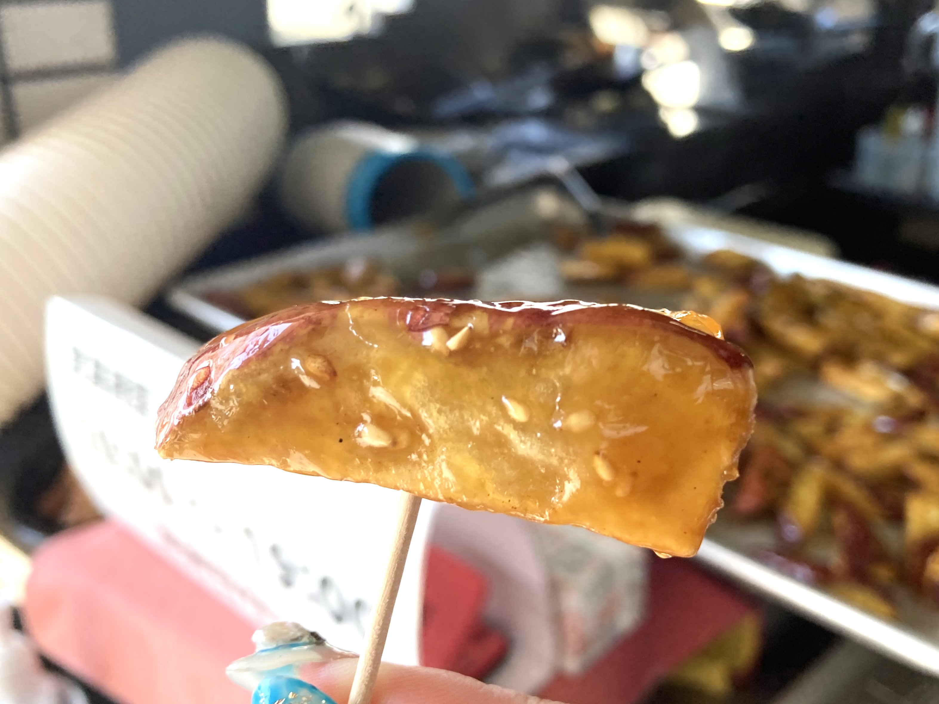 大きく切られたお芋。このお芋に、飴が結構分厚い層になって絡んでいます。