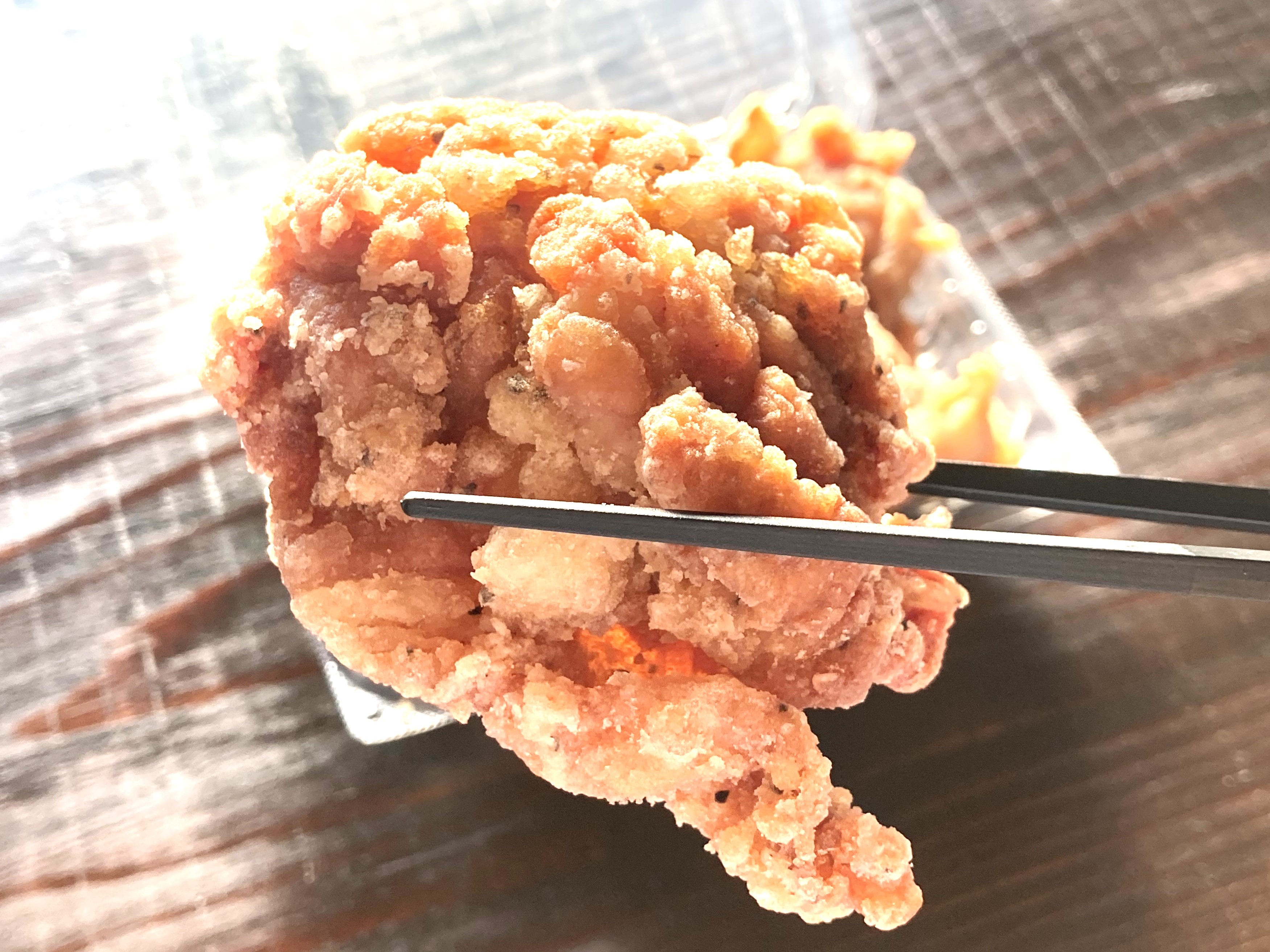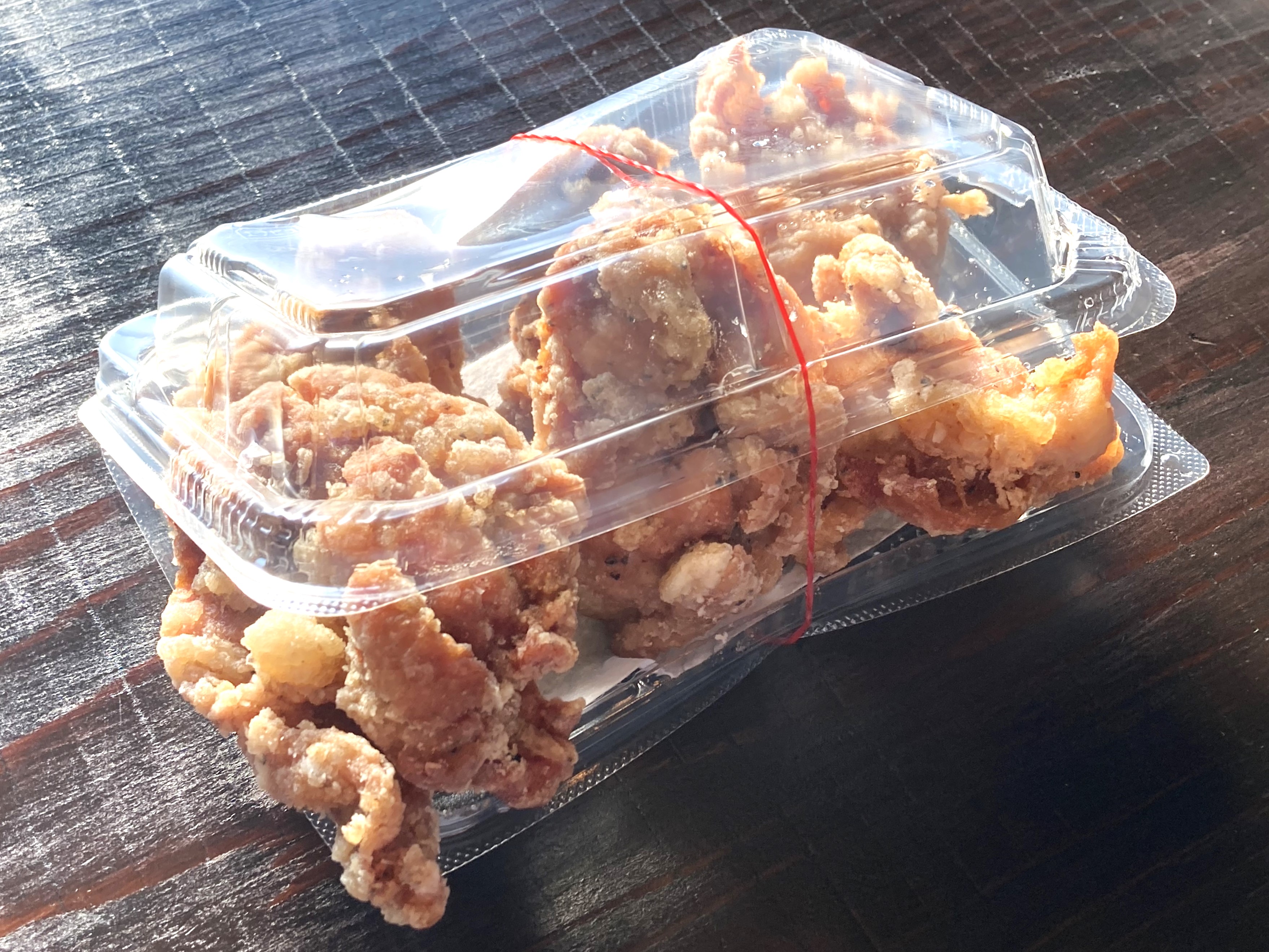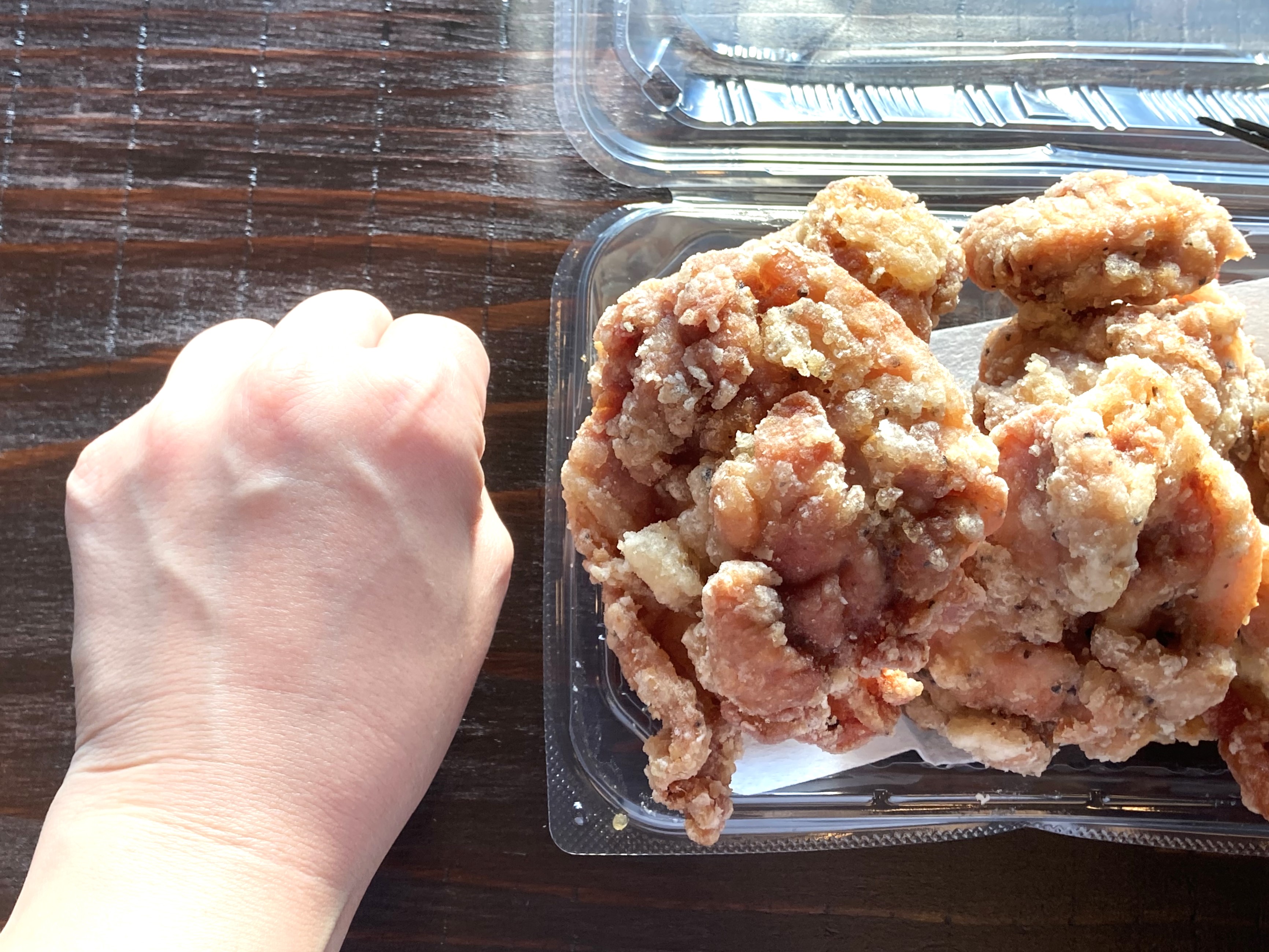 とりあえず6個入(650円)を頼んだんですが、頼んだ後にお店の方から「うちのからあげはかなり大きいんですよ。」と驚愕のお言葉。見てください。本気で私のこぶしより大きい。