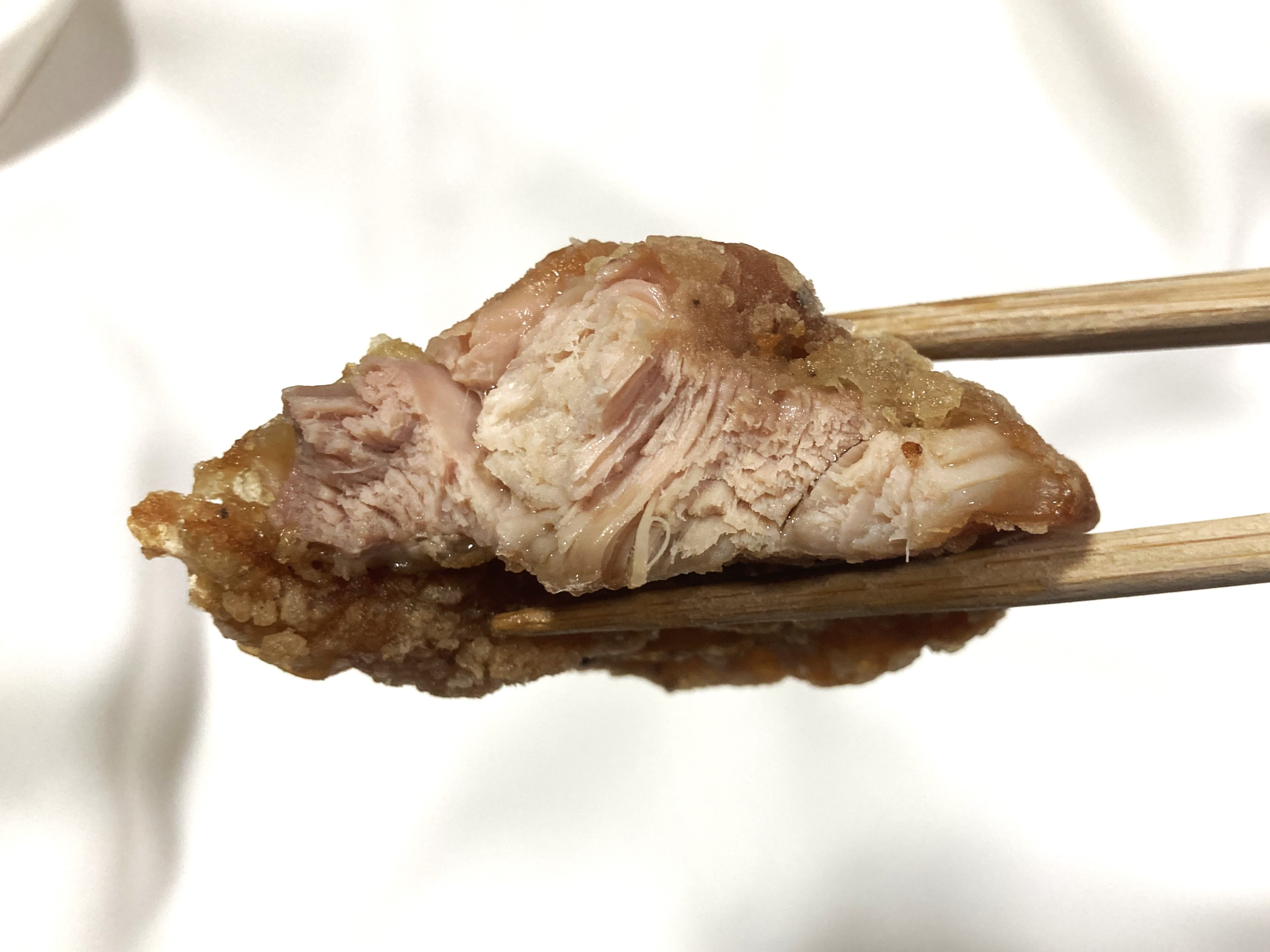 お箸を持ち上げるとずっしり重い。衣はパリパリしているタイプ。食べるまでに時間が経っていたんですが、それでも揚げたてみたいにパリパリ。