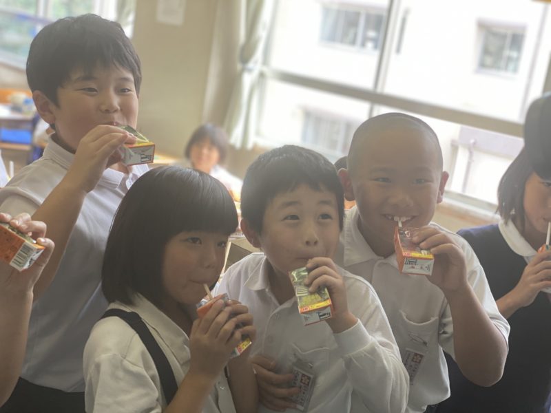 ジューシーをぐびぐび飲むシーンに協力してくれたのは、熊本市立託麻東小学校2年1組のみんな。