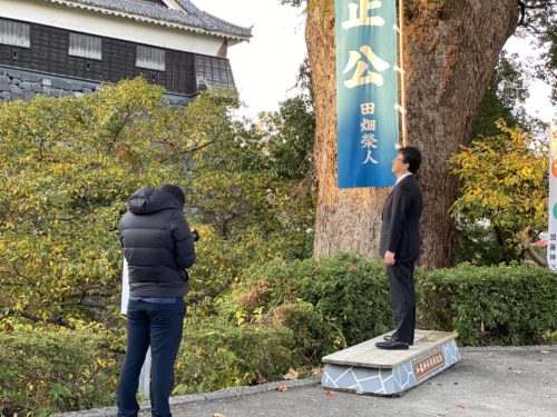 朝7時に加藤神社に来ていただいたのですが、もうね朝日がめっちゃまぶしいんですよ。市長が立っているあの場所。私もリハで何度か立ったんですが、正直数秒でギブするほど。