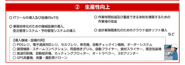 生産性をあげるために、新たに機械設備などを投入するのも対象。