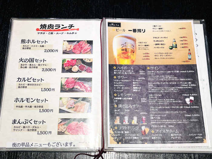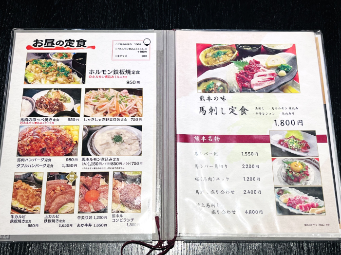 そして、こちらがランチメニュー。焼肉メニューの価格に比べるとかなりお得です。定食以外にもお昼から馬刺しが食べられるのは贅沢ですね。