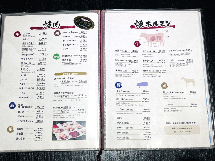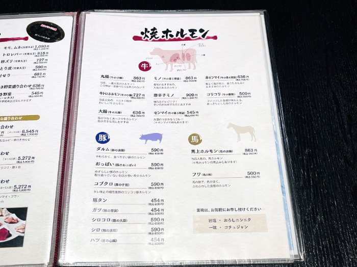 私の記憶だと…焼肉屋さんのホルモンメニューって丸腸!ミノ!センマイ!みたいな部位が書いてある感じでした。このメニューは牛・豚・馬の記載と、それぞれの部位が書いてありました。店名に“ホルモン”と付くだけあってホルモンもメニューも豊富です。