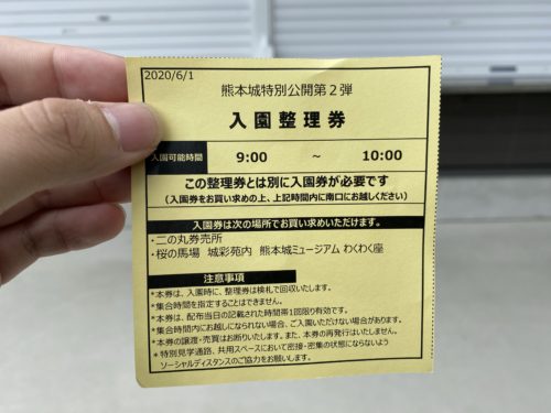 整理券の配布場所は、熊本城ミュージアムわくわく座(城彩苑内)、二の丸券売所、シャトルバス降車場(見学通路)の三箇所です。