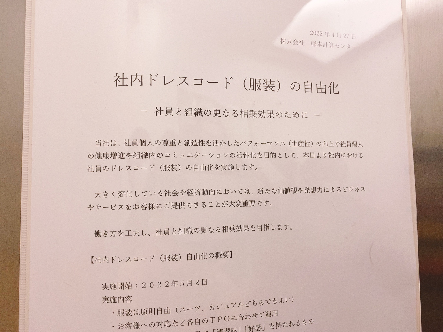 株式会社熊本計算センターでは、長く働ける環境づくりの一環として、会社が一方的に規則を作るのではなく、社員が自ら出す希望で規則を作っていっているのだそう。