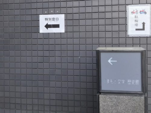 本の受け取りが可能な「特別窓口」は、正面玄関から貼り紙で案内があるので、その方向に進んでいけばたどり着けます。