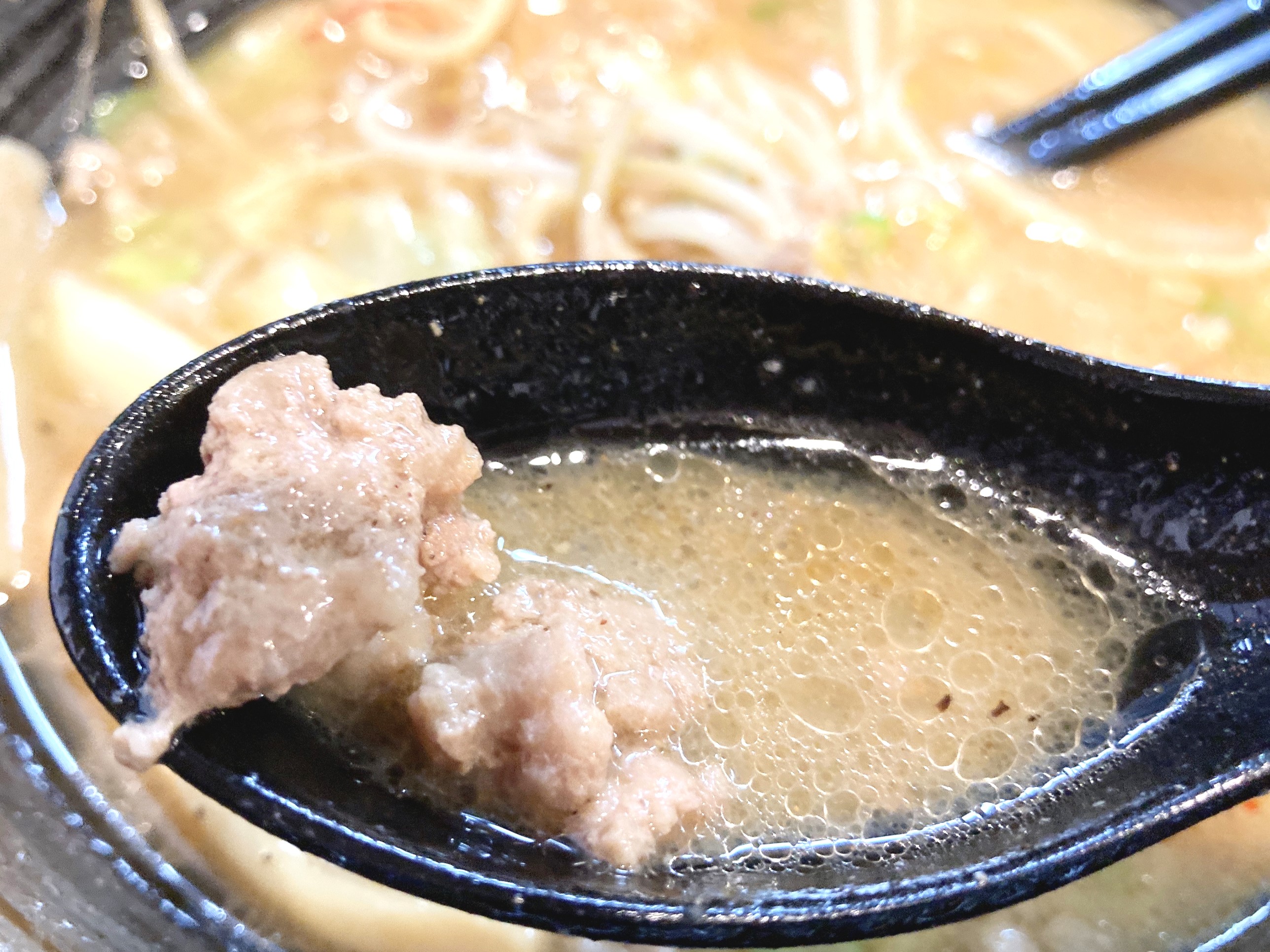 ミンチと言っていいのか迷うくらいの粗びき。だから、とってもジューシーで食べ応えがあります。スープとの相性もばっちりです。