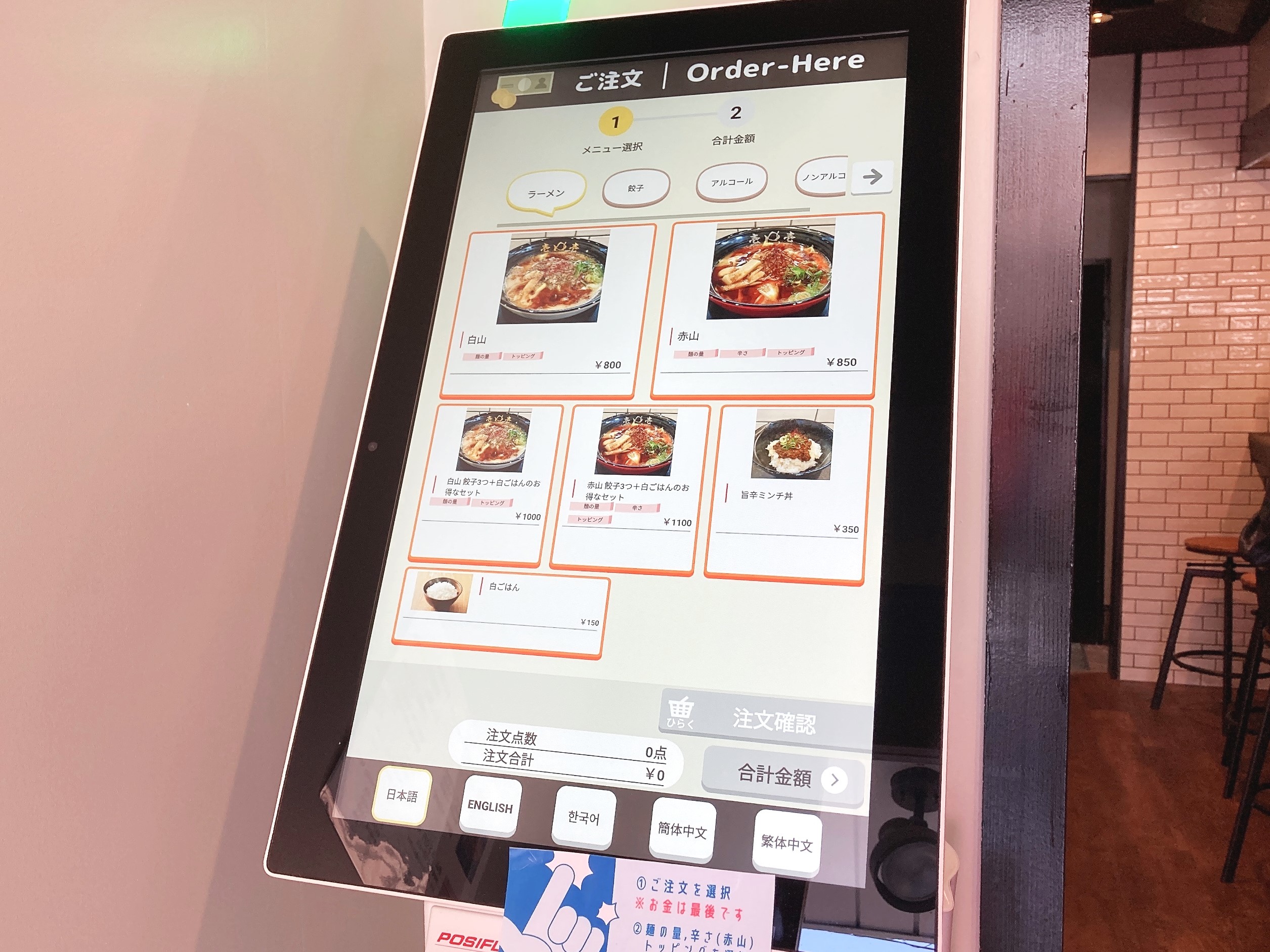 入口のドアをあけると食券機がお出迎えしてくれるので、まずはメニュー選び。メニューは写真付きなので分かりやすいですね。お腹が空いている方にはセットもありました。