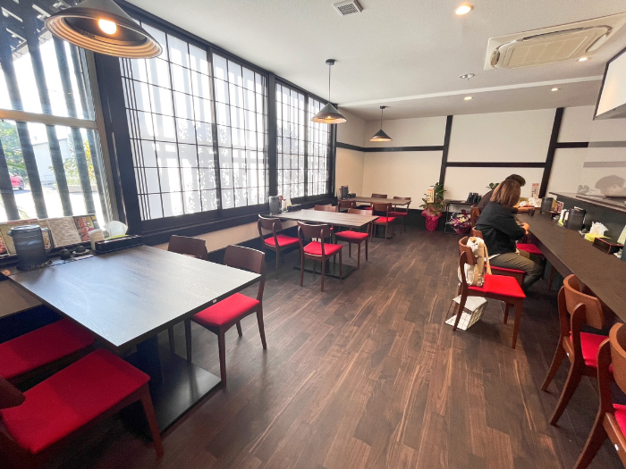 食券を購入したらお席へ。カウンター席とテーブル席があります。落ち着いた色味のテーブルに赤のイスがアクセントになっていてお洒落ですね!