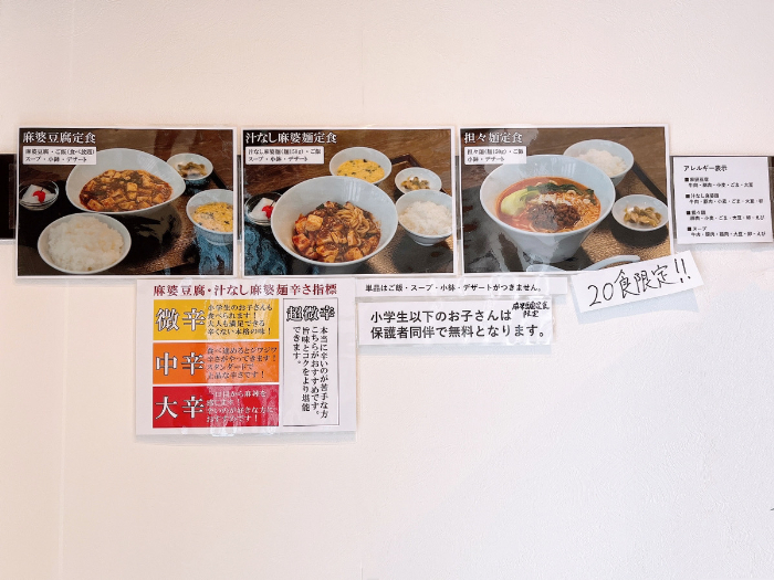 メニューは麻婆豆腐・汁なし麻婆麺・担々麵の3種類。これから麻婆炒飯も追加されるそうです。麺類は単品と定食が選べて、定食になると、ごはん・スープ・小鉢・デザートが付きます。