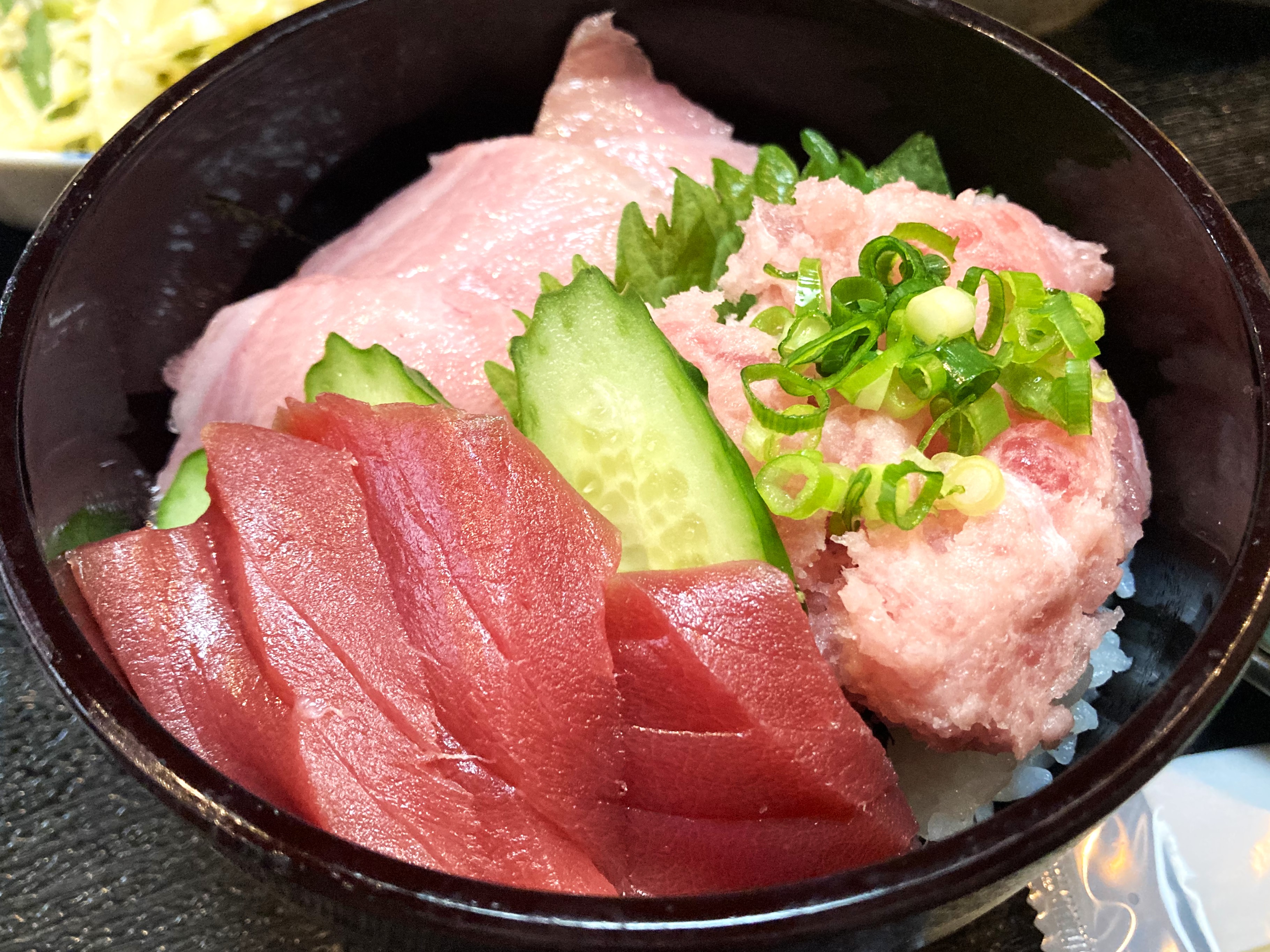 赤身・中トロ・ネギトロの3色丼で1,400円。美味しいしなにしろ安い!やっぱり熊本がよかばい。
