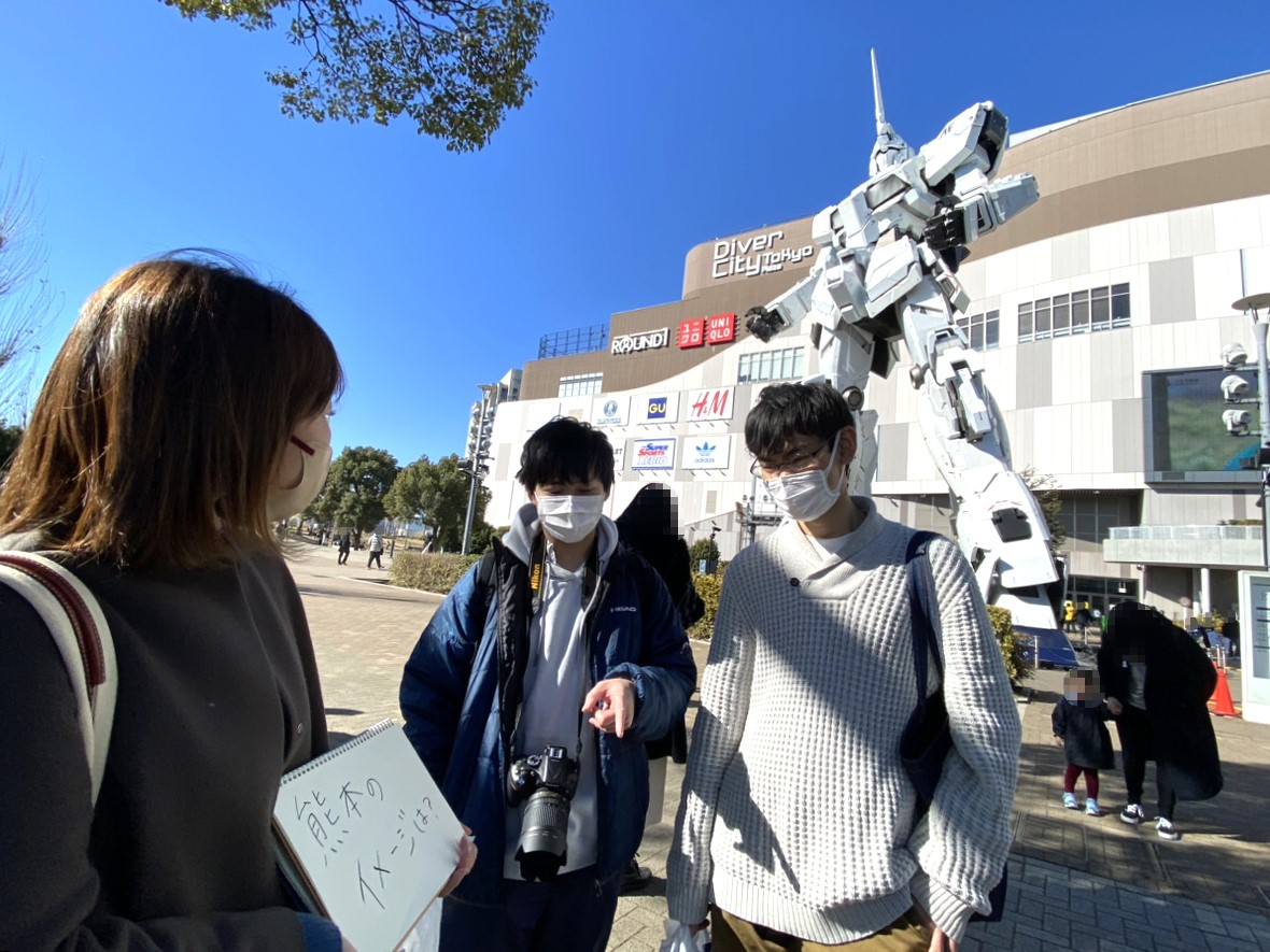 ここで出会った20代男性2人に聞いてみました。2人はガンダムが好きでグッズを買ってきたところだそうです。