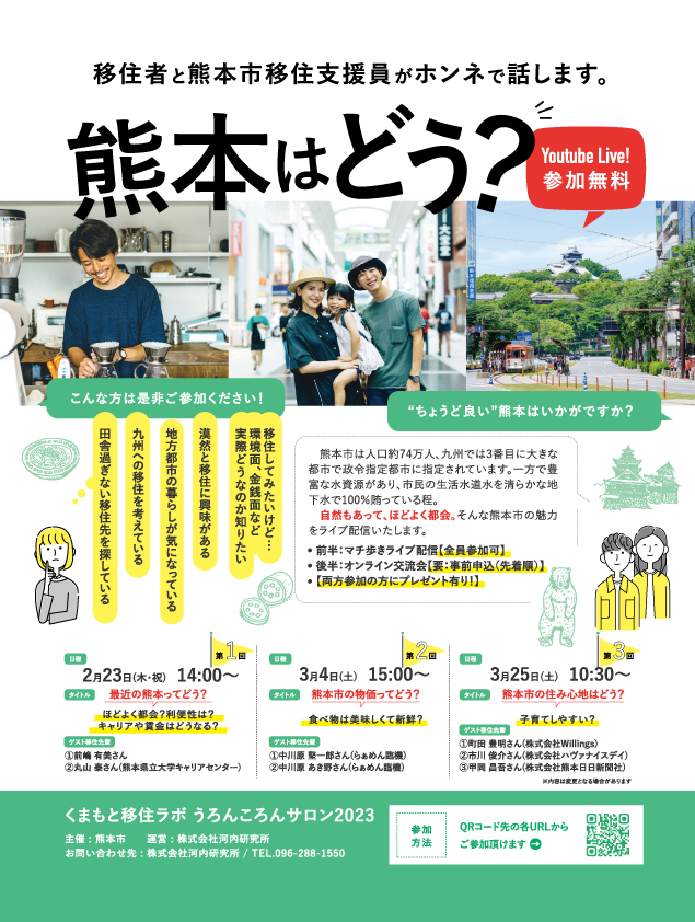 「ライブ配信イベントは合計3回!大事なことなのでもう一度言いますね!1回目は熊本の利便性や就職、2回目は物価、3回目は家族での住みやすさ。交流会に参加するとプレゼントもあります。」