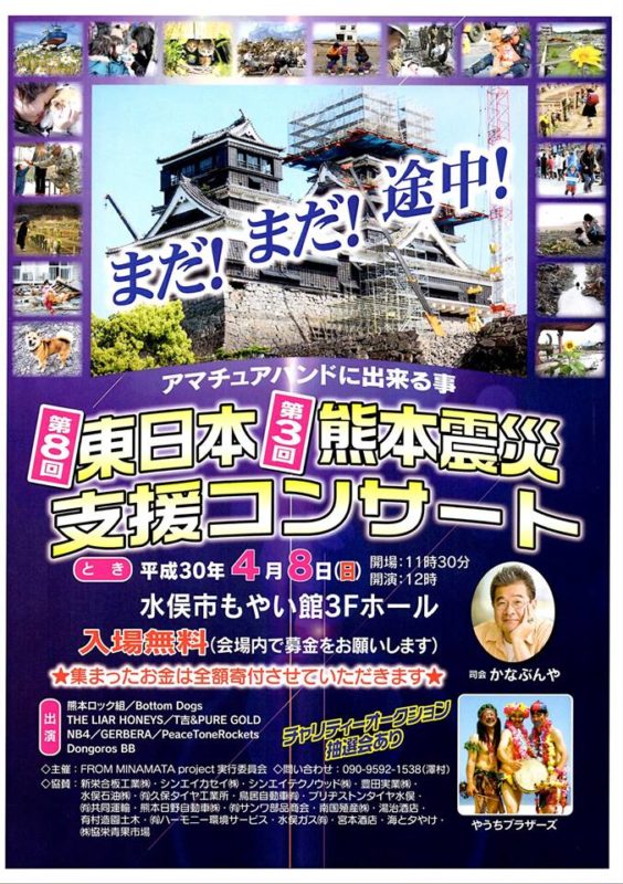 4月8日(日)、水俣市牧ノ内にある水俣もやい館で熊本のアマチュアバンドのよる「第8回東日本・第3回熊本震災支援コンサート」が開催されます。