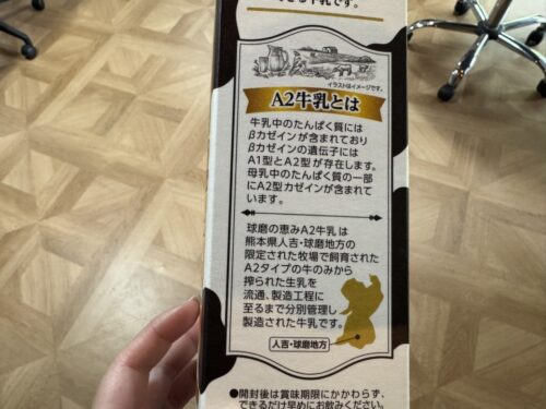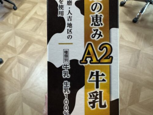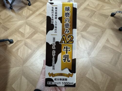 さてこちらが新発売の牛乳「球磨の恵みA2牛乳」です。