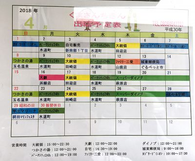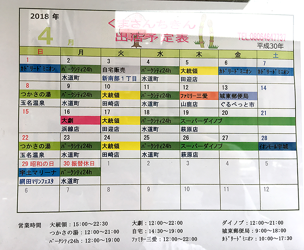 「くまさんちきん」は、主に週末は各種イベント会場や観光施設、平日だとパチンコ店の駐車場スペースなどでの営業が多いようです。