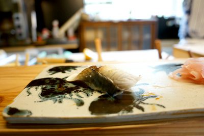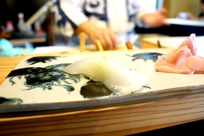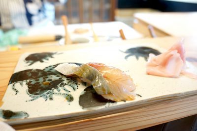 このお皿の上に、店主の握ったお寿司が置かれていきます。