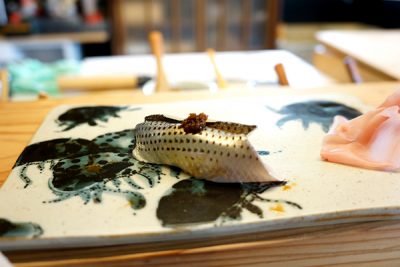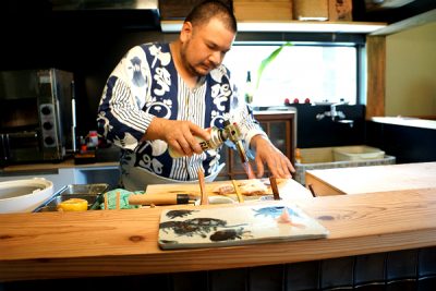 一貫ずつカウンターで握って様々な趣向を加え、完成された1つの寿司が皿に置かれ、その寿司を食べる。