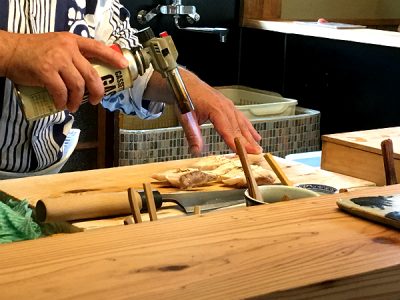 今度はバーナーが出てきました。寿司の表面を軽く炙っております。