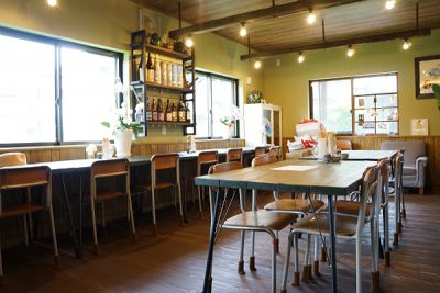近くの小学校が過疎のため閉校となり、そのままでは処分されてしまう机・椅子を譲り受けお店の座席として今も使われているそうです。