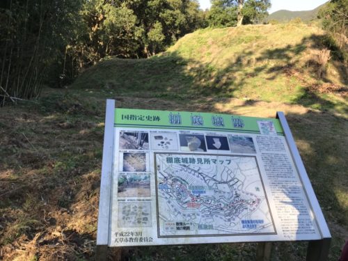 少し歩くと、14~16世紀後半まで利用されたという、国指定史跡・棚底城跡がありました。8つの郭に土塁、横堀、竪堀などが残る重厚な縄張りの山城です。