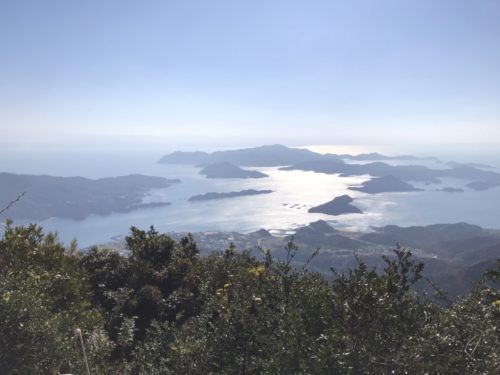 山の途中に広々とした平地が広がり、パラグライダーのテイクオフの場所がありました。眼下には海や島々が見渡せて、もうここが頂上でもいいのではないかと思うほどの絶景!