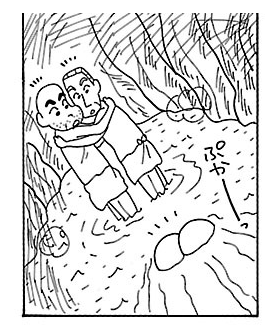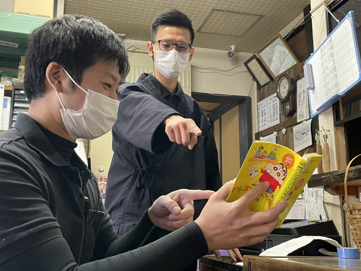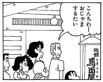 「すみません、突然ですがクレヨンしんちゃんに出てくるこのコマをみていただけますか?原作者の臼井先生がこちらの旅館のお風呂に入られたことがあるそうで、もしかしたら作中の洞窟風呂のモデルになったんじゃないかと思ってきたんですが。これ見てもらえます?」