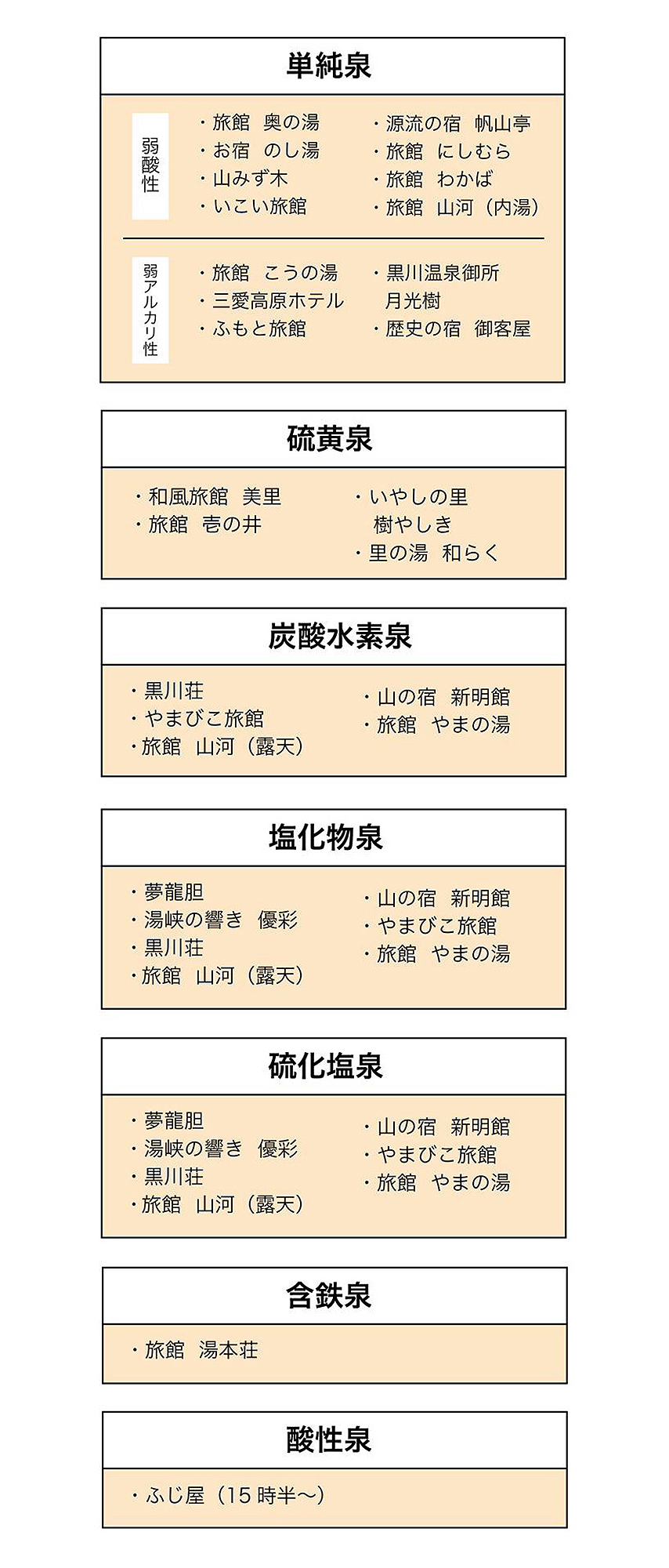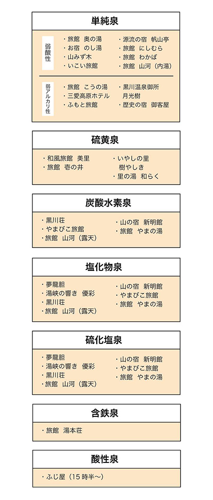 日本の温泉の泉質というのは約10種類あるそうなのですが、黒川温泉の泉質はそのうち7種類もあるそうなんです!