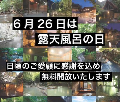 「黒川温泉観光旅館協同組合」は、6月26日を「6(ろ)天26(フロ)の日」として、「露天風呂の日」に認定。黒川温泉を愛するお客さまへの感謝の日とすると共に、当日の黒川温泉の組合加盟店の内の24施設の露天風呂入浴料が無料となるサービスを発表されました。