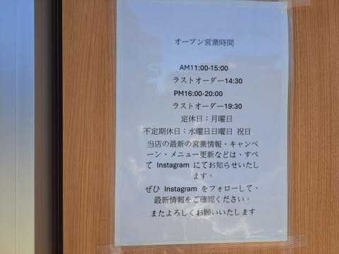 | 定休日 | ・11月まで 定休:月曜日 不定休:水曜日・日曜日・祝日 ・12月以降 全日不定休(インスタグラムのストーリーズや投稿で確認ください) |