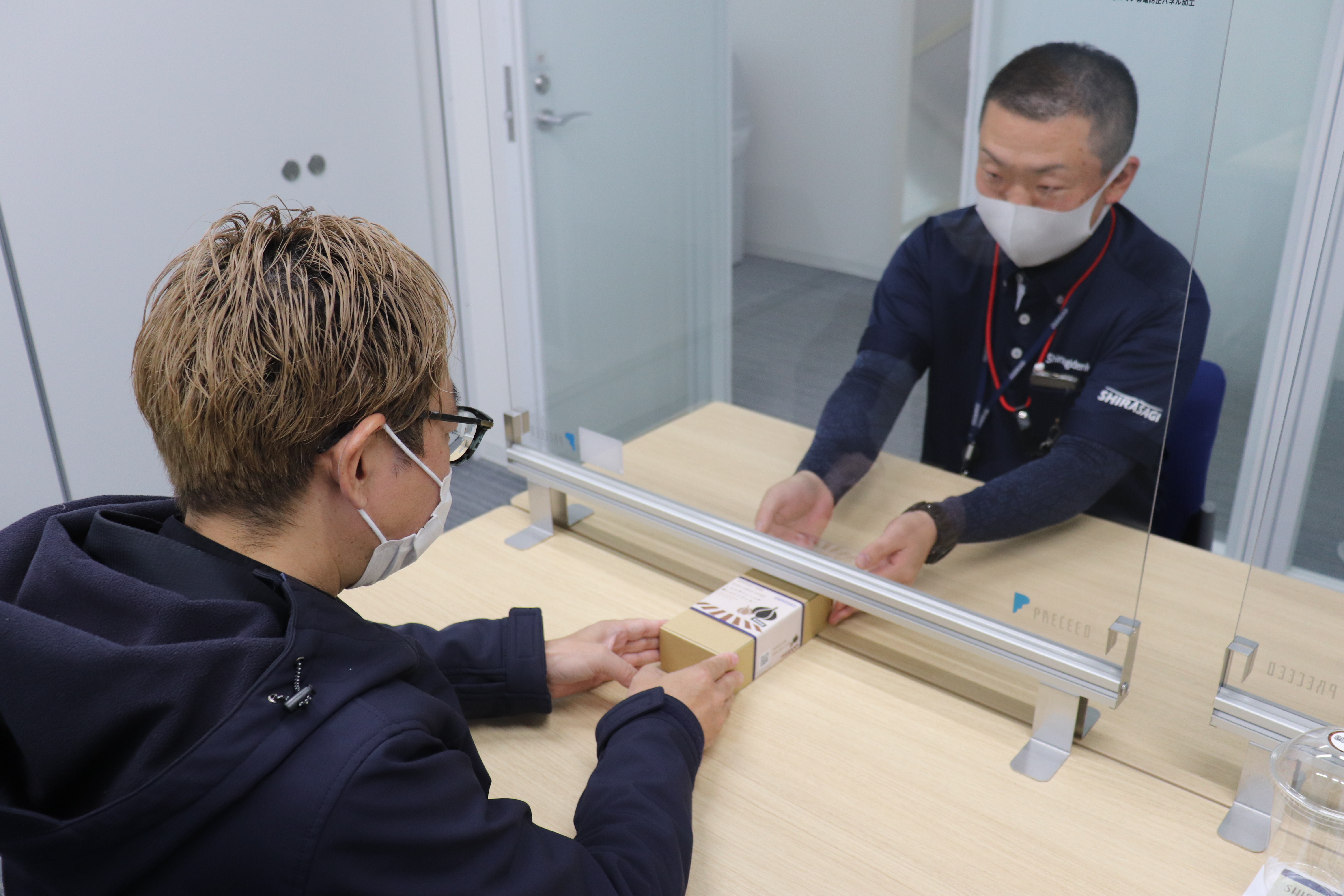 シンプルでおしゃれに梱包された包み箱を、コロナ対策ばっちりで手渡されました。