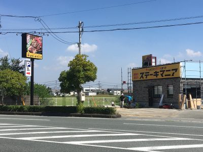 また、「とりボンバー浜線店」が閉店後、一年以上の長い間空き店舗になっていましたが、なんとそこには「ステーキマニア」の看板が!?