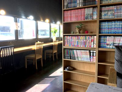 店内には漫画本が多数並んでいます。昔ながらの定食屋のように、食事を待つ間や食事後などに、本を楽しむことができます。