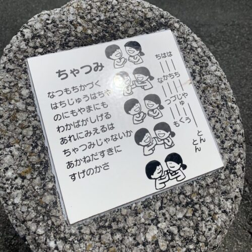 ここにも童謡がありますが…ん?左側の車止めの上に、何か…?