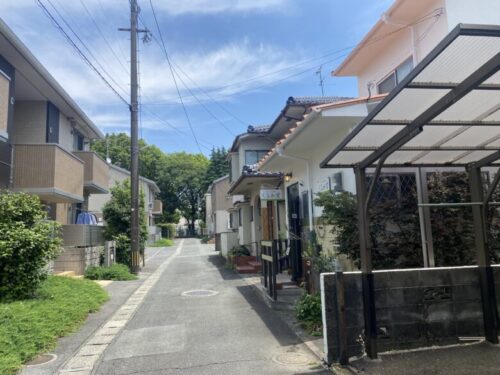 託麻原小学校が道の奥に見える、住宅街。