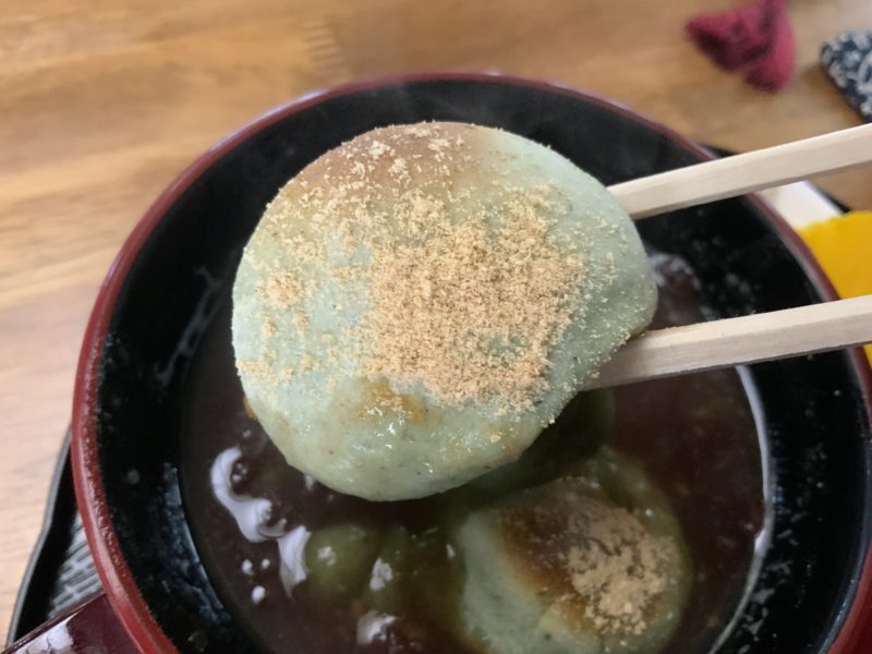 あまーいぜんざいに、こんがり焼かれた草餅が乗ってきなこがまぶしてあります。お漬物がついてくるのもたまりませんね。