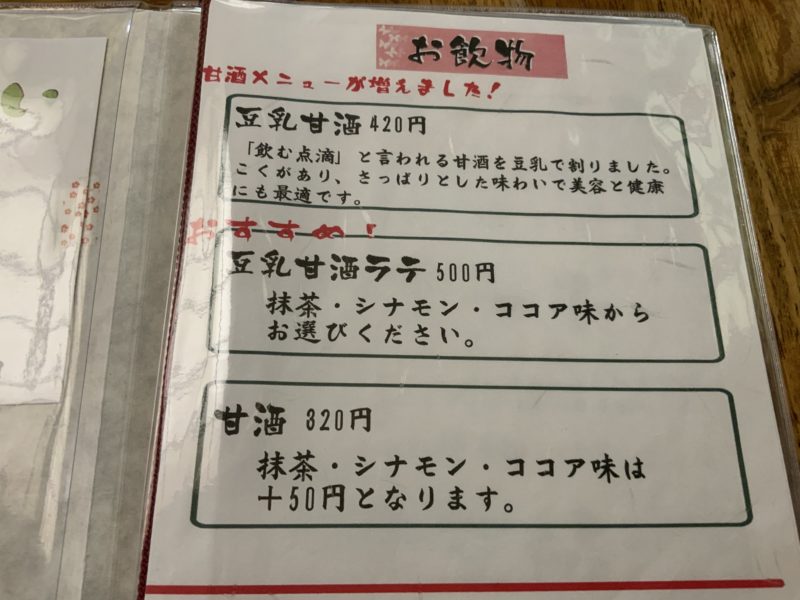 通常の甘酒に加え、豆乳甘酒、豆乳甘酒ラテなんかもあるので、甘酒そのままは苦手!という人でも楽しめます。