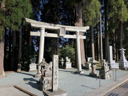 木立の中に大きな鳥居がそびえ、狛犬が鎮座しています。