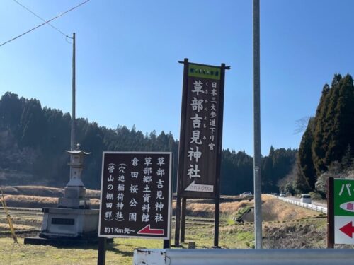 その国道325号線沿いに「日本三大参道下り宮 草部吉見神社」という大きな茶色の看板があり、ここから脇道へと入ります。