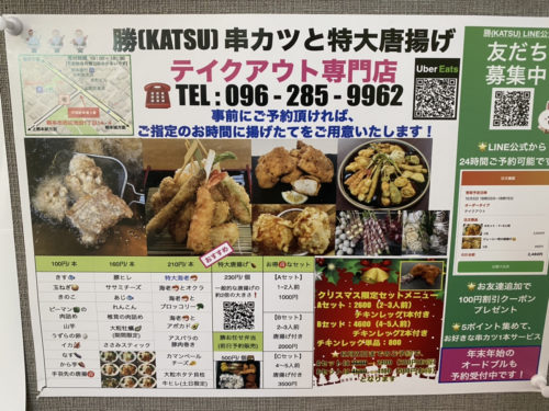 今回は、県道303号線から一本入った場所にある勝(KATSU)熊本さんという串カツと特大唐揚げのテイクアウト専門店にお邪魔してきました!