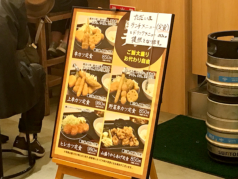 ランチは串カツ定食を始めとしたこの5種類。ヒレカツ定食や大盛り唐揚げ定食などもあります。