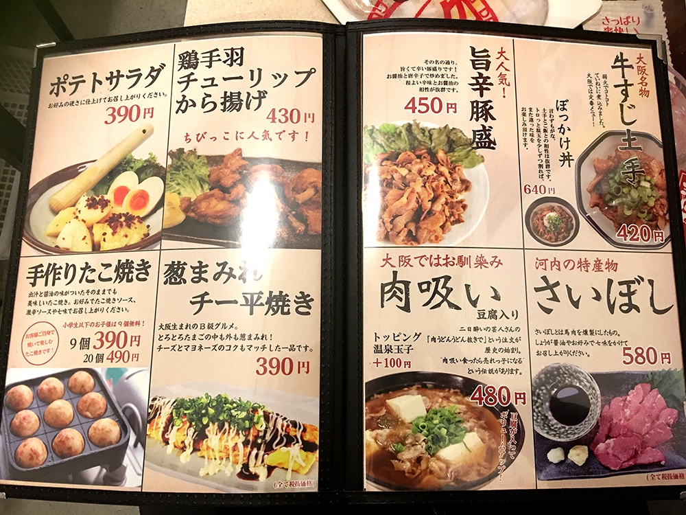 牛すじ、さいぼし、肉吸い、チー平焼き、旨辛豚盛り、そしてたこ焼き!