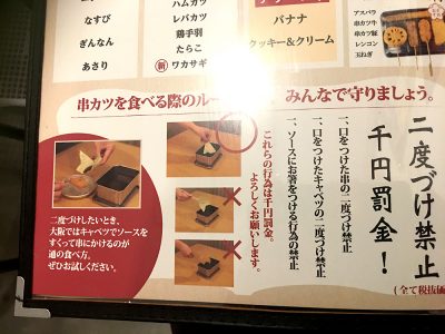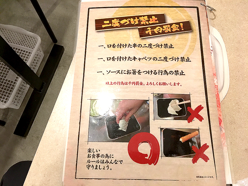 大阪の串カツ屋さんでは、容器に少し辛めのソースが入れらて、1グループにつき1つ提供されます。カウンター席でも、ソースは数席に1つしかない、“ソースは共有”という考え方が一般的です。数名でひとつの容器のソースを使うので、「一度口を付けたらもうソース漬けられません!」ということです。